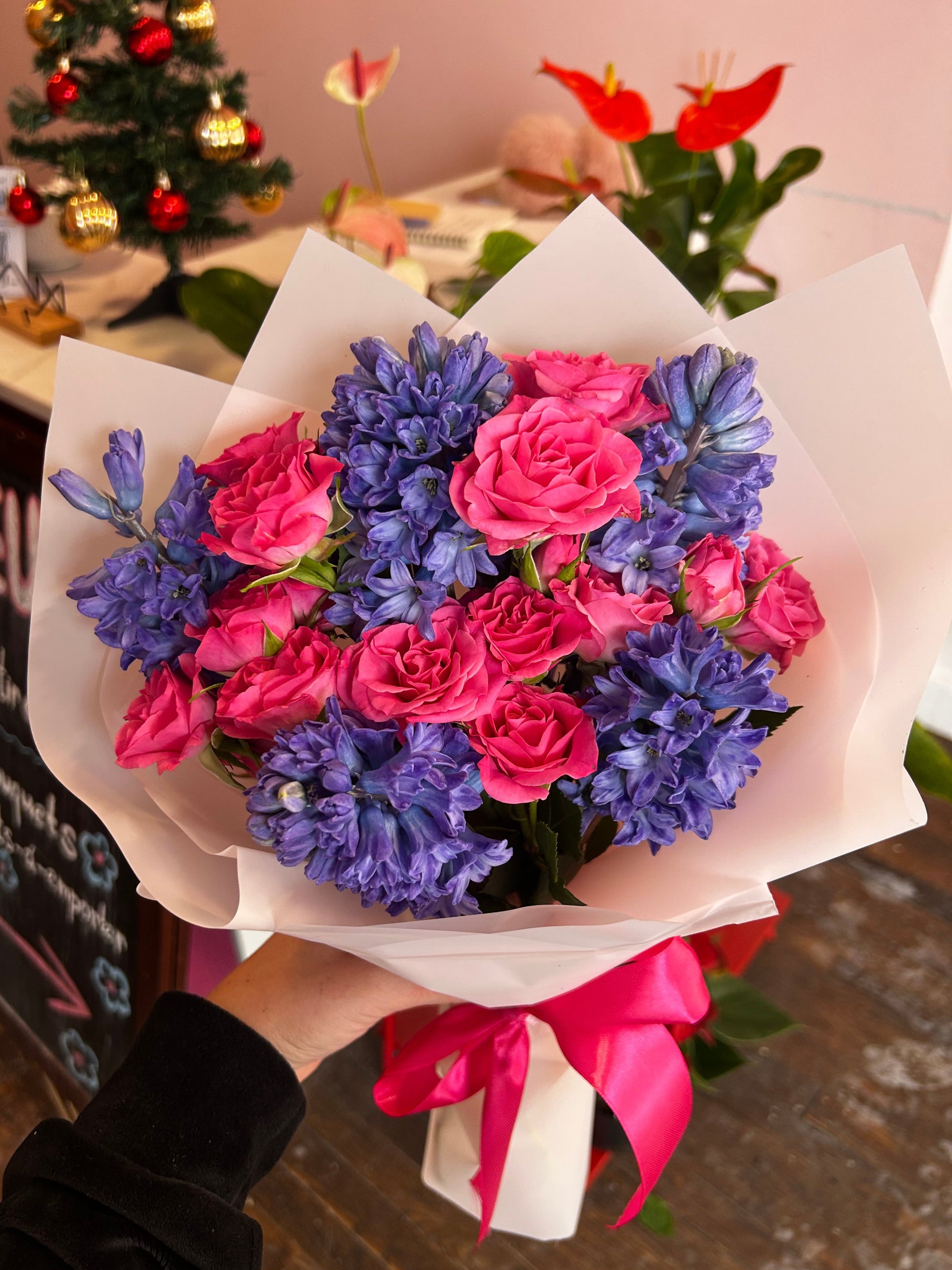 A delicate yet vibrant bouquet featuring bright pink roses paired with rich blue-violet hyacinths. The contrast of colors creates a fresh, romantic look, while the soft fragrance of hyacinths adds a memorable finishing touch. A perfect choice for birthdays, special moments, or simply to make someone smile.