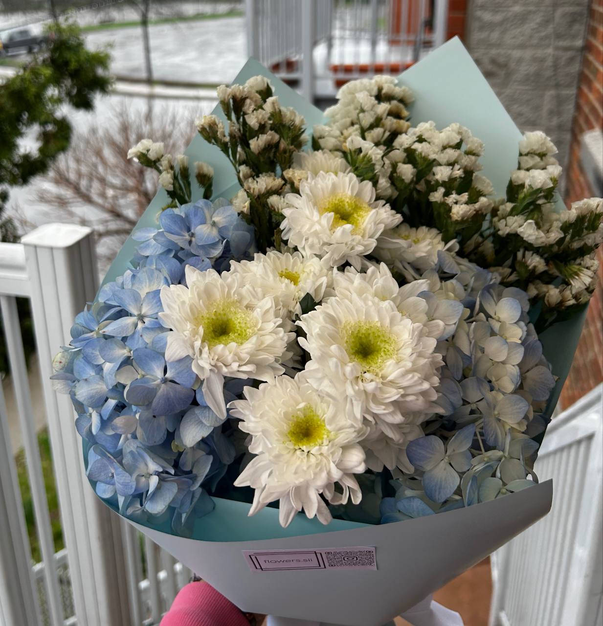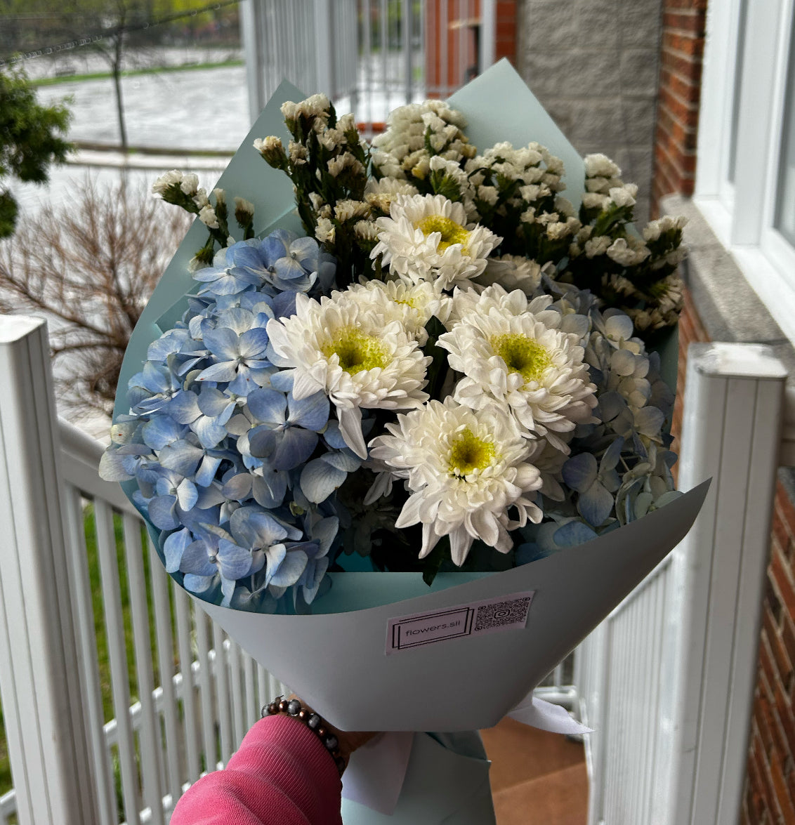 2 blue hydrangeas, 1 white chrysanthemum, and dried flowers in a light blue wrap. A soft and fresh combination — perfect for a thoughtful gesture or gentle surprise. Flower delivery in Montreal