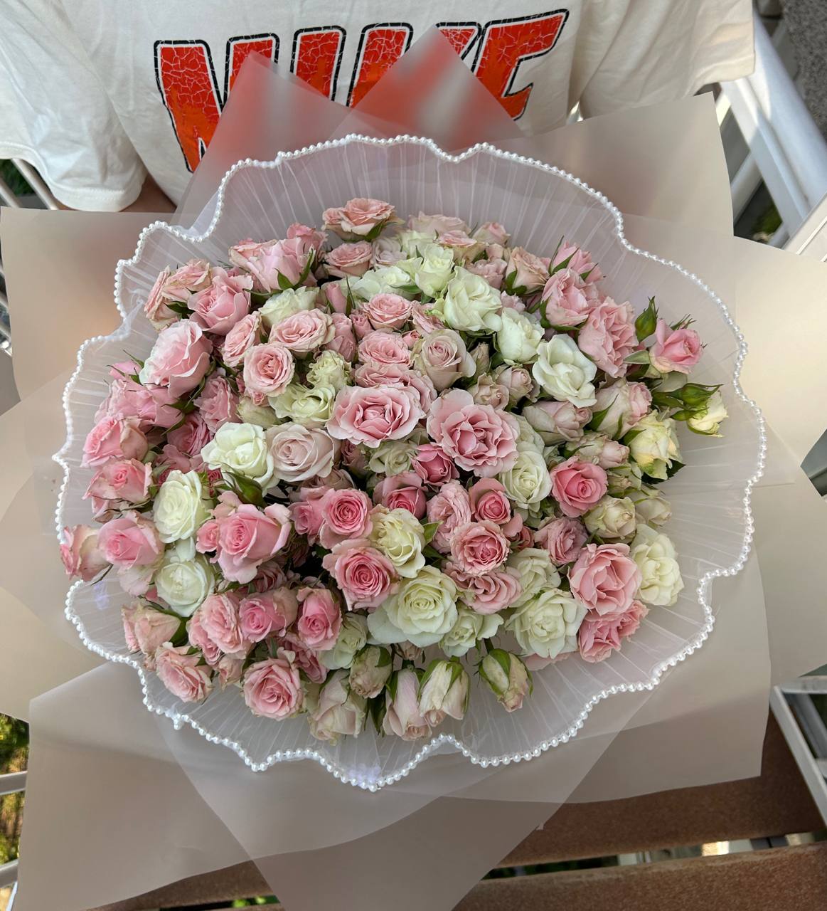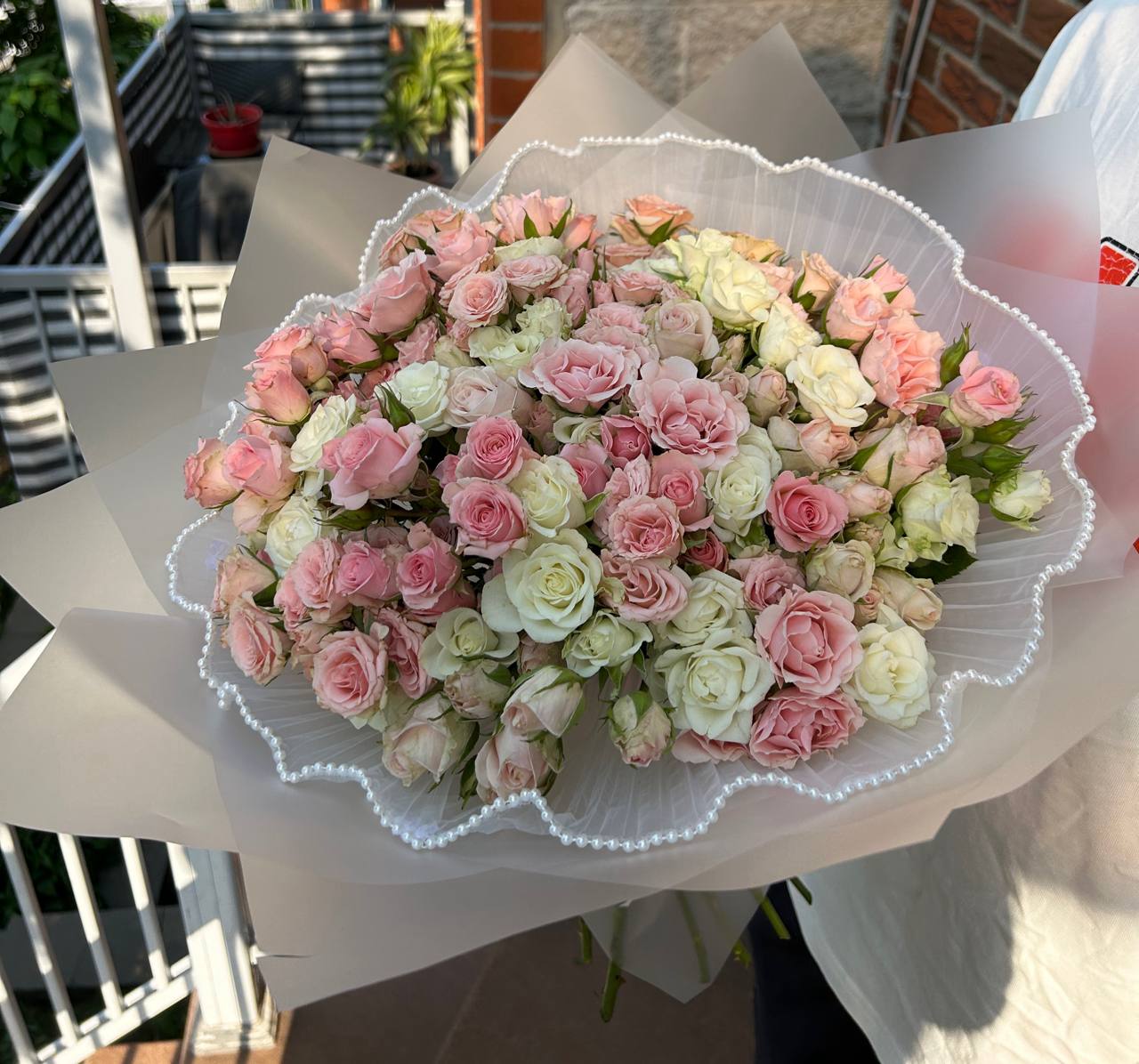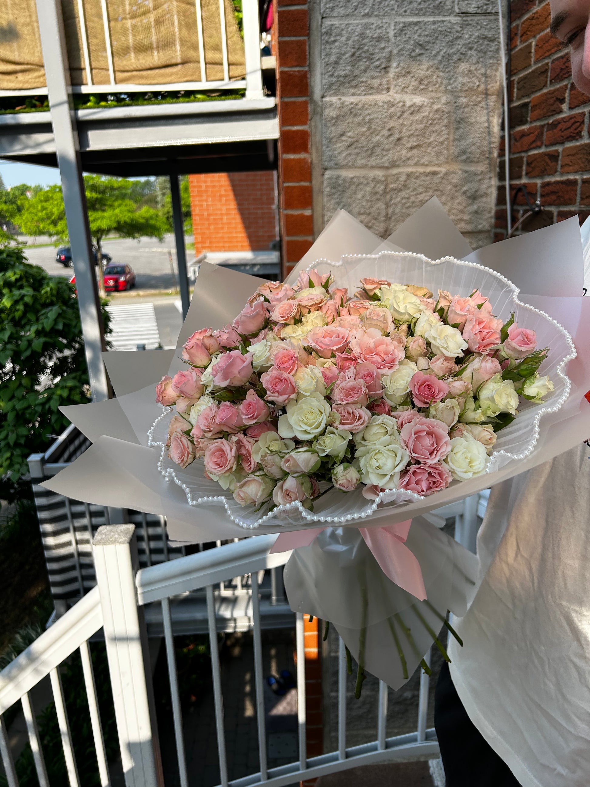 30 stems of spray roses in soft pink and creamy white tones. Wrapped in elegant matte paper and adorned with a delicate pearl trim and satin ribbon. Flower delivery in Montreal