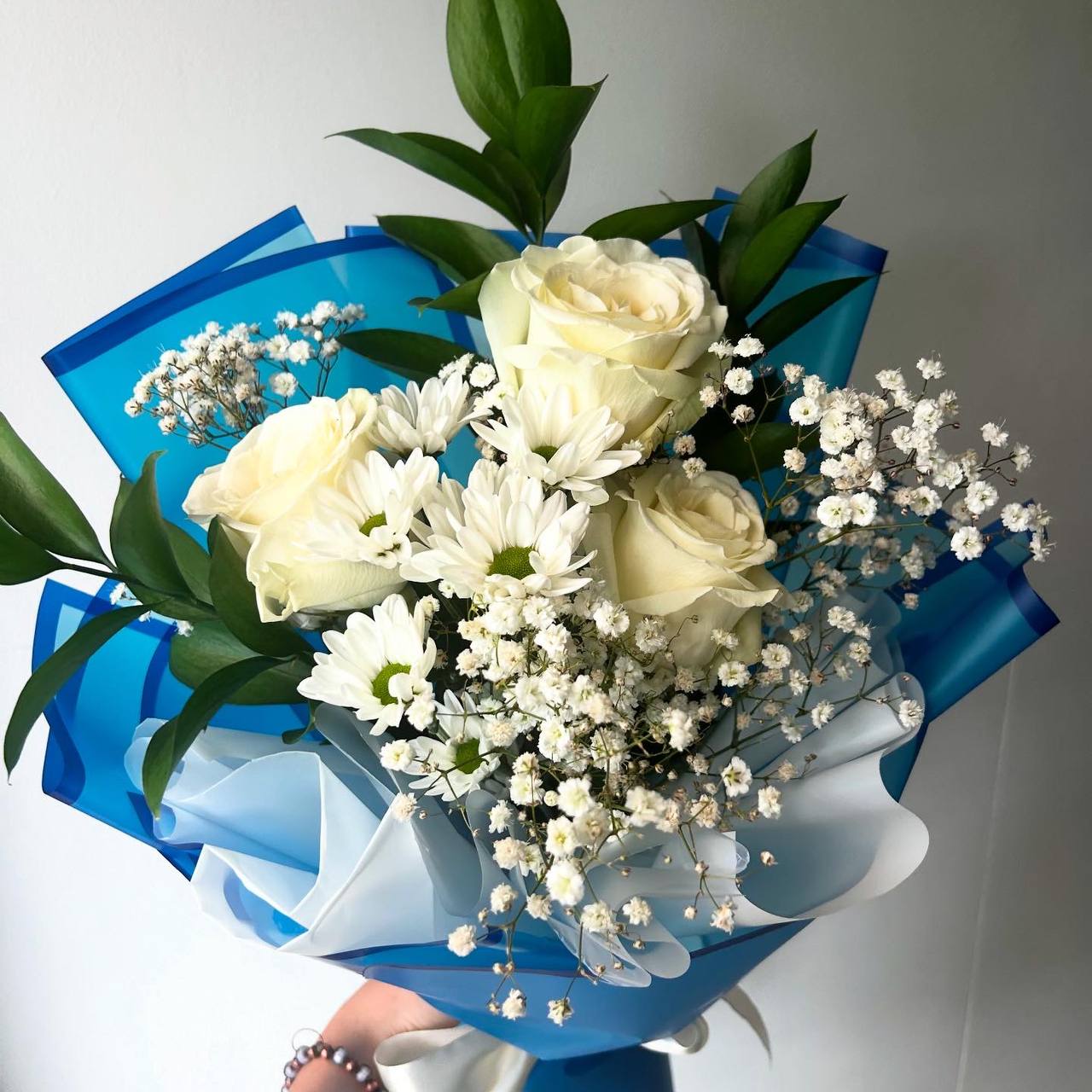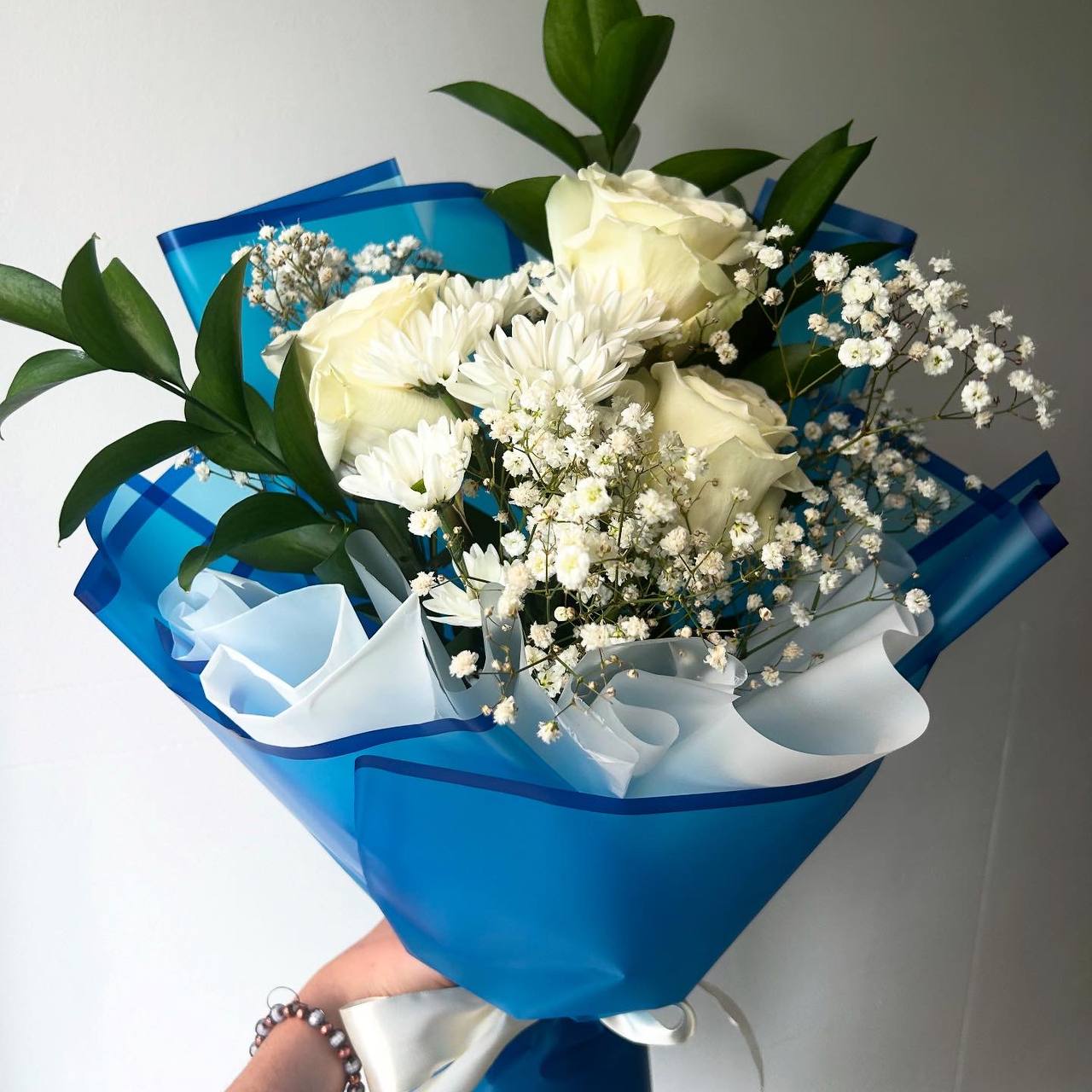 3 white roses, lush greenery and baby's breath. Wrapped in elegant blue film. Flower delivery in Montreal