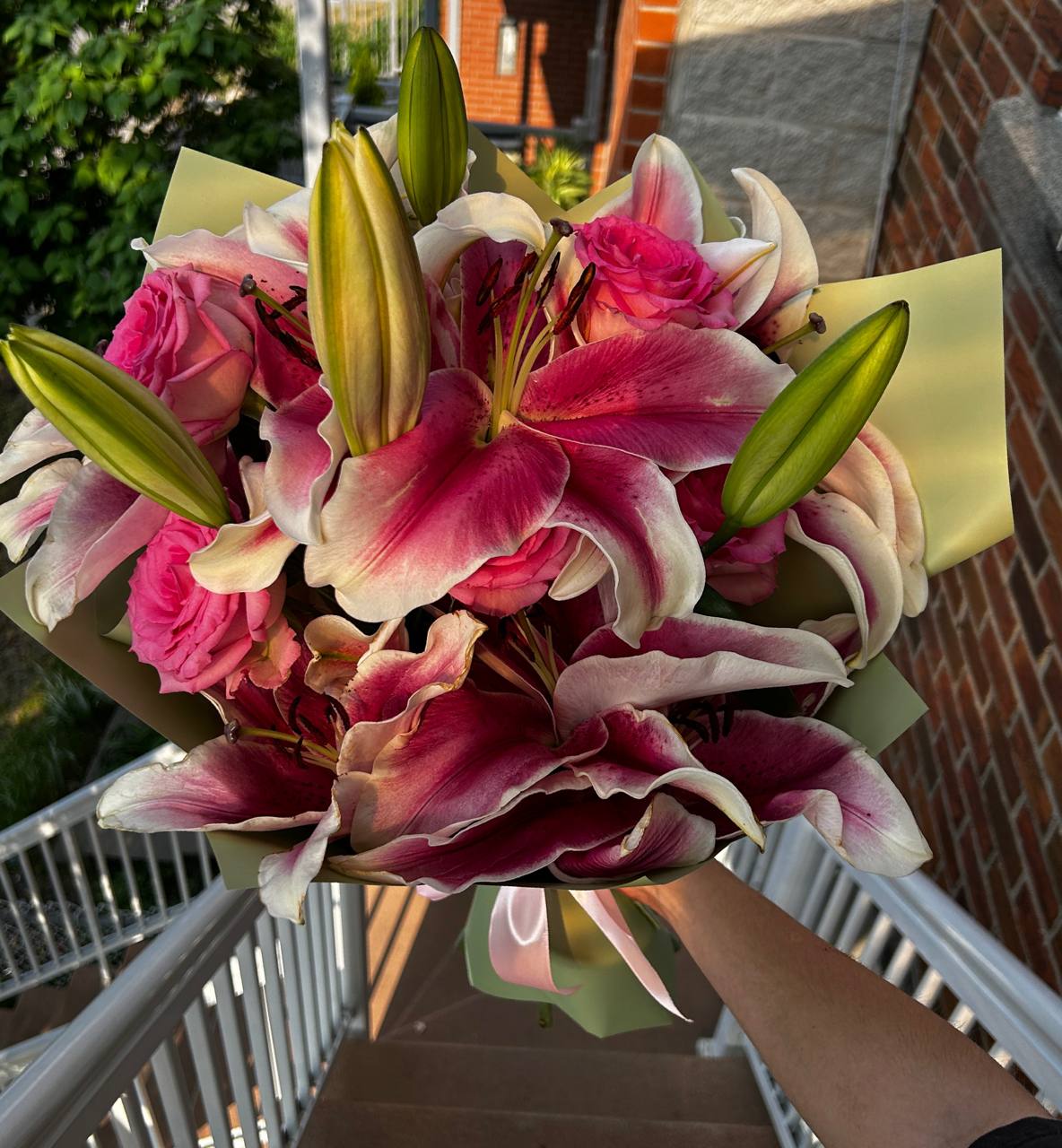 A stunning bouquet featuring 3 elegant lilies, 5 premium roses, and 5 carnations. Wrapped in stylish green floral paper, this arrangement brings freshness and harmony to any moment. Flower delivery in Montreal