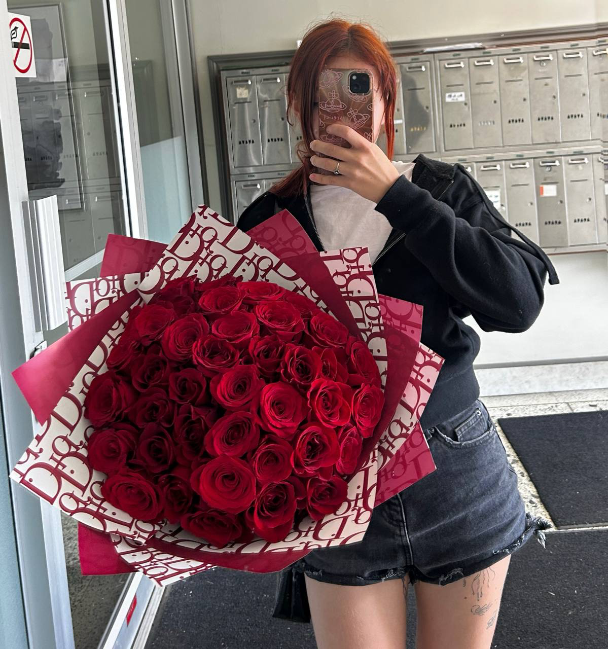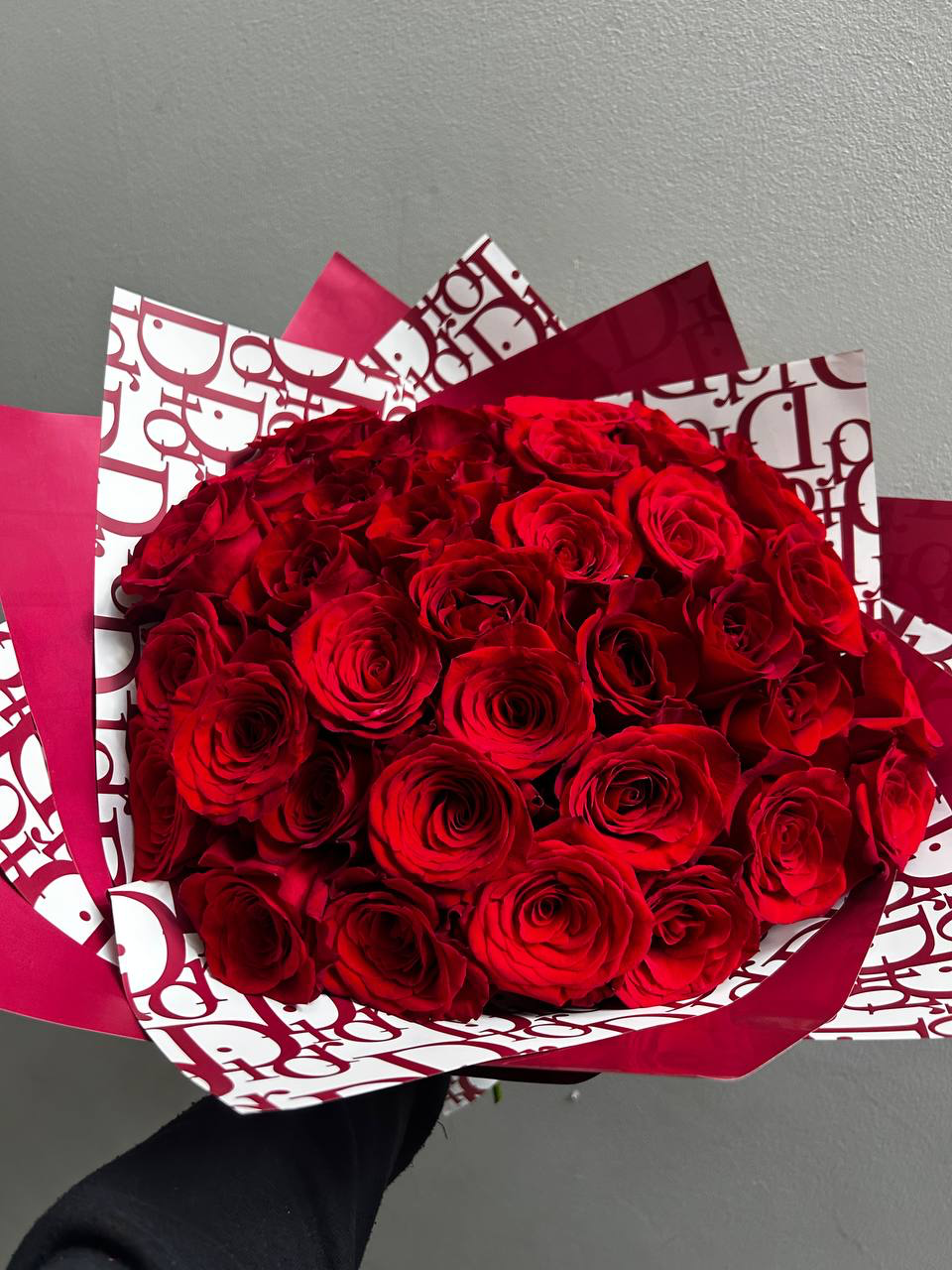 An elegant large bouquet of 40 premium red roses, wrapped in a chic designer paper. Perfect for expressing deep love, passion, and admiration. A luxurious choice for special occasions.