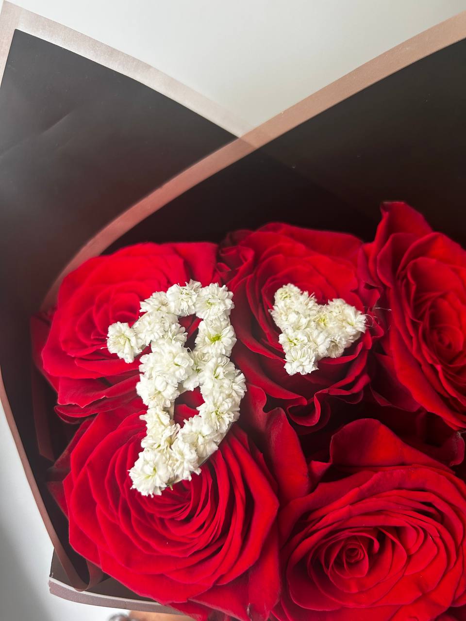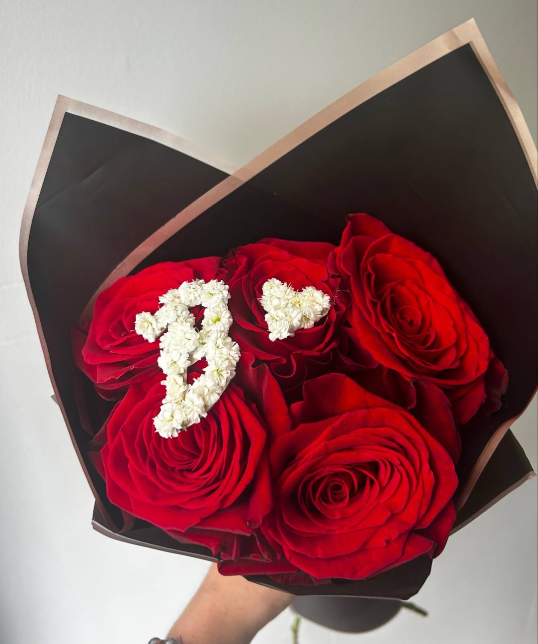 5 roses arranged in elegant wrapping with a custom initial and heart decoration. A charming bouquet perfect for romantic gestures, personal messages, or special surprises. Flower delivery in Montreal