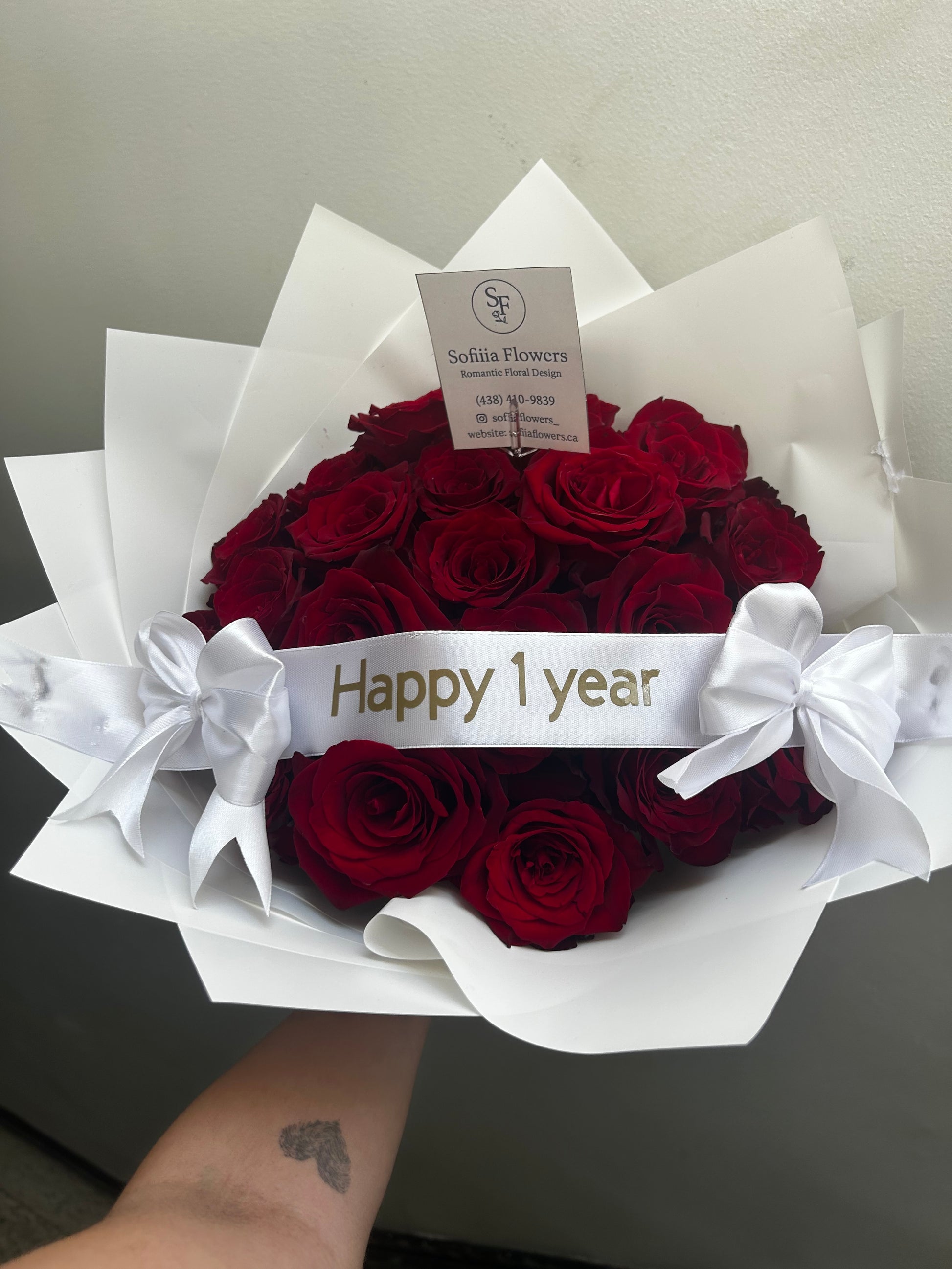 A romantic bouquet of 20 velvety red roses, elegantly wrapped in white for a timeless look. The highlight of this arrangement is a custom banner with your chosen text — perfect for marking anniversaries, birthdays, or any special milestone. Add your message in the order notes, and we’ll make your gift truly one of a kind.