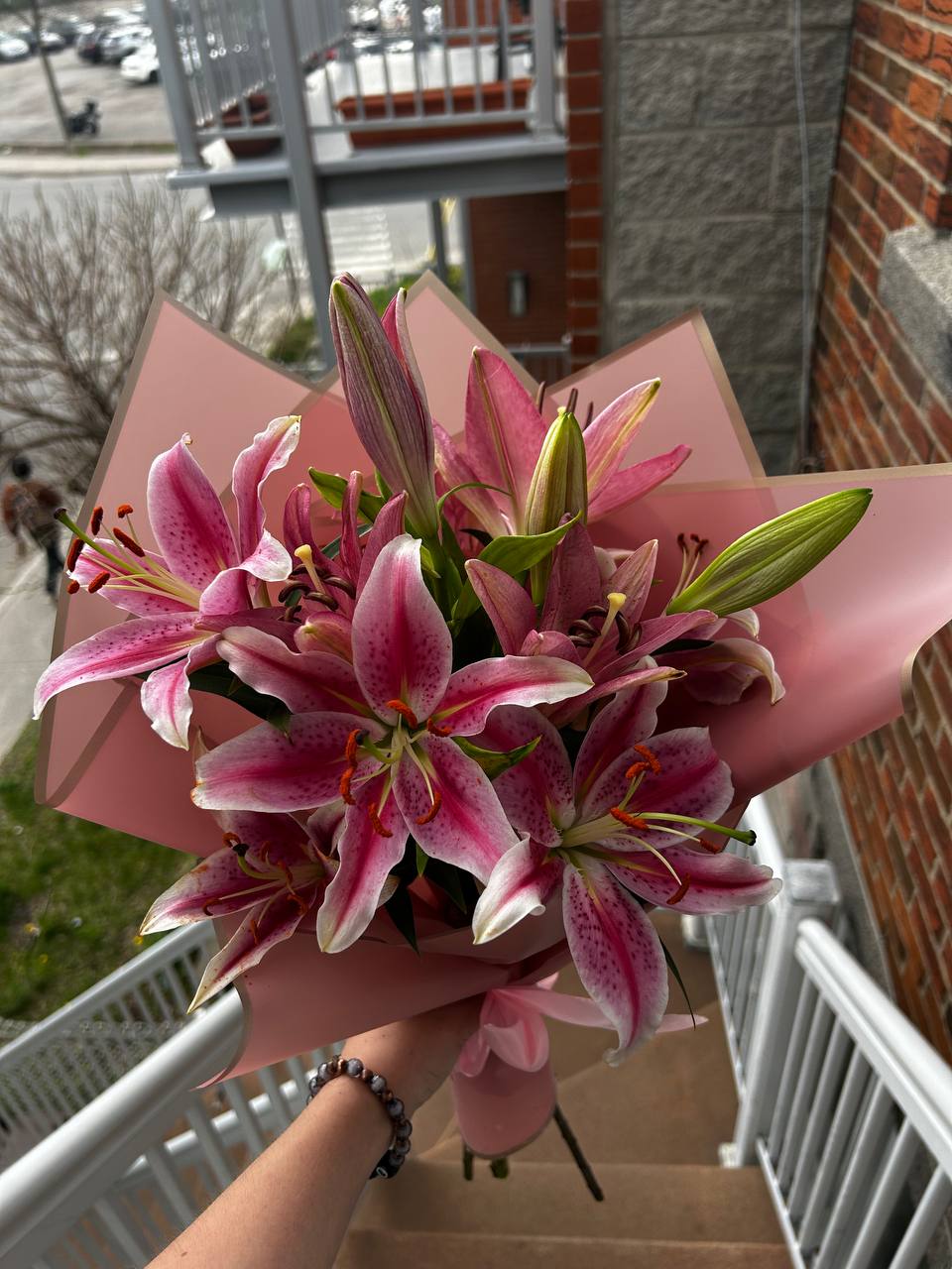 3 stems of vibrant pink oriental lilies in a soft pink wrap with matching satin ribbon. Elegant and fragrant. Flower delivery in Montreal
