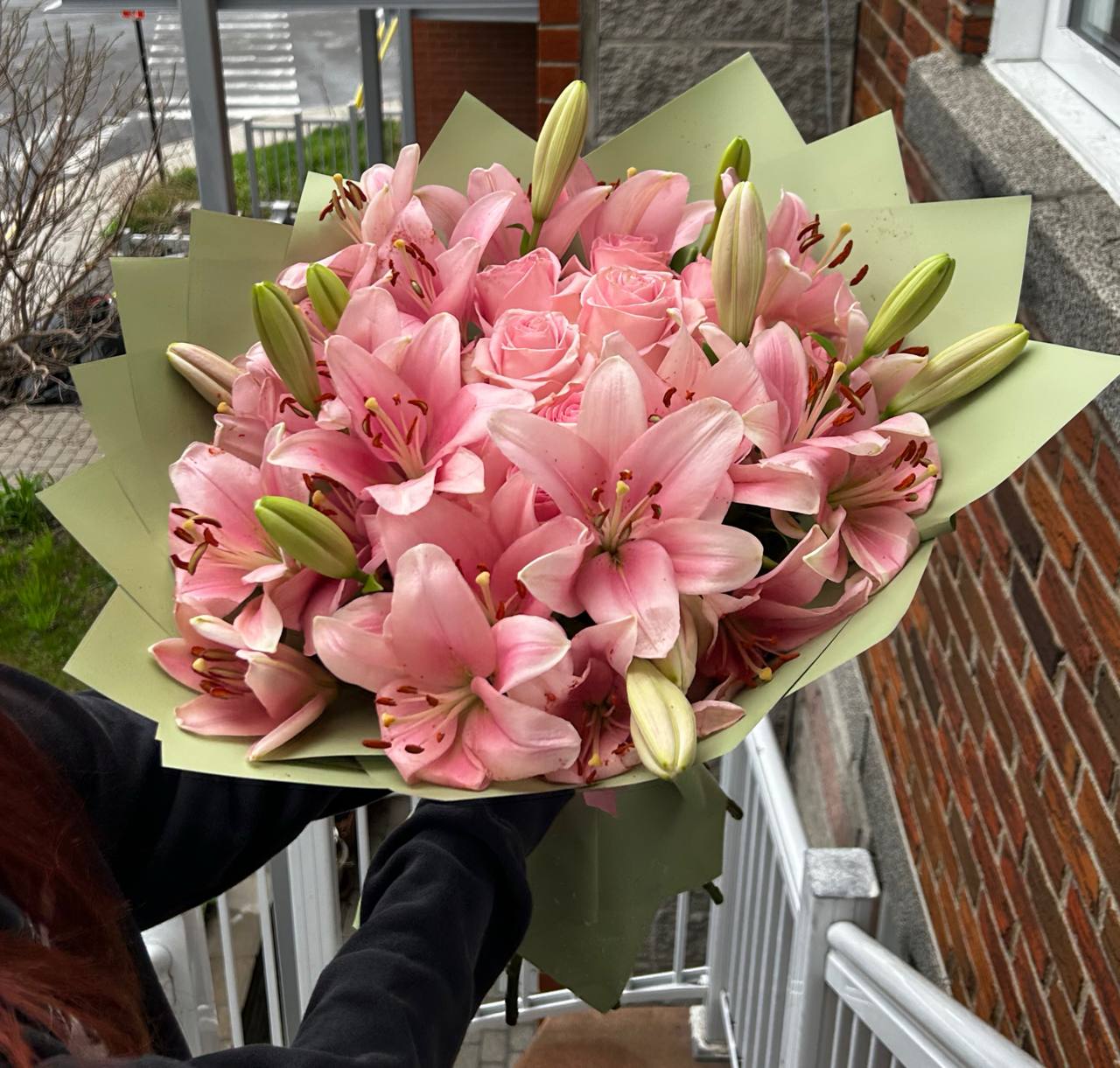 A luxurious arrangement of 15 pink roses and 8 stems of lilies, full of charm and fragrance.