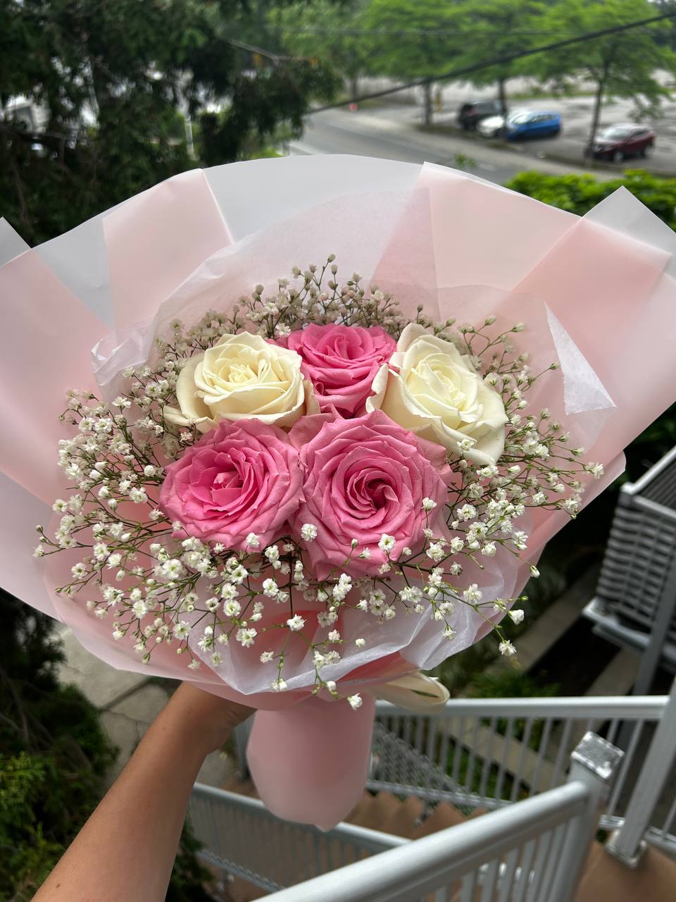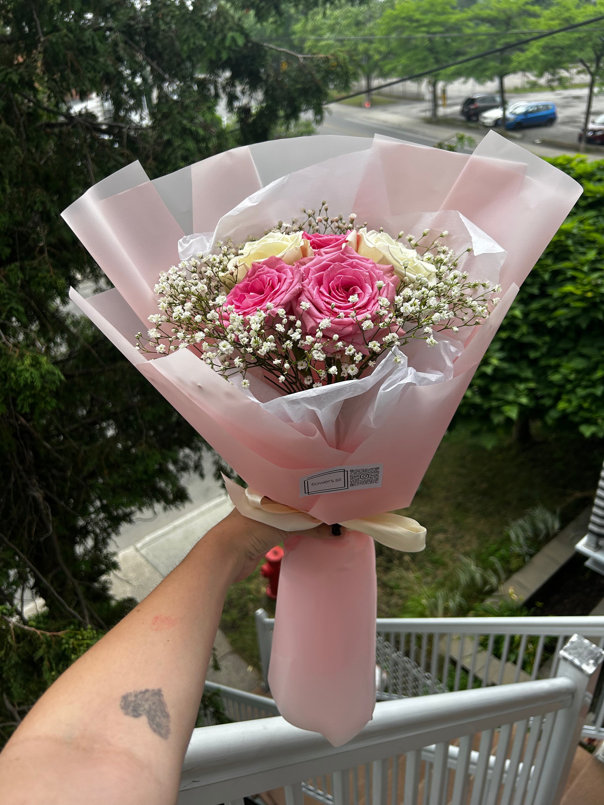 A delicate small bouquet featuring 5 soft roses and airy gypsophila. Gracefully wrapped in a minimalist white style — ideal for gentle gestures or elegant occasions. Flower delivery in Montreal