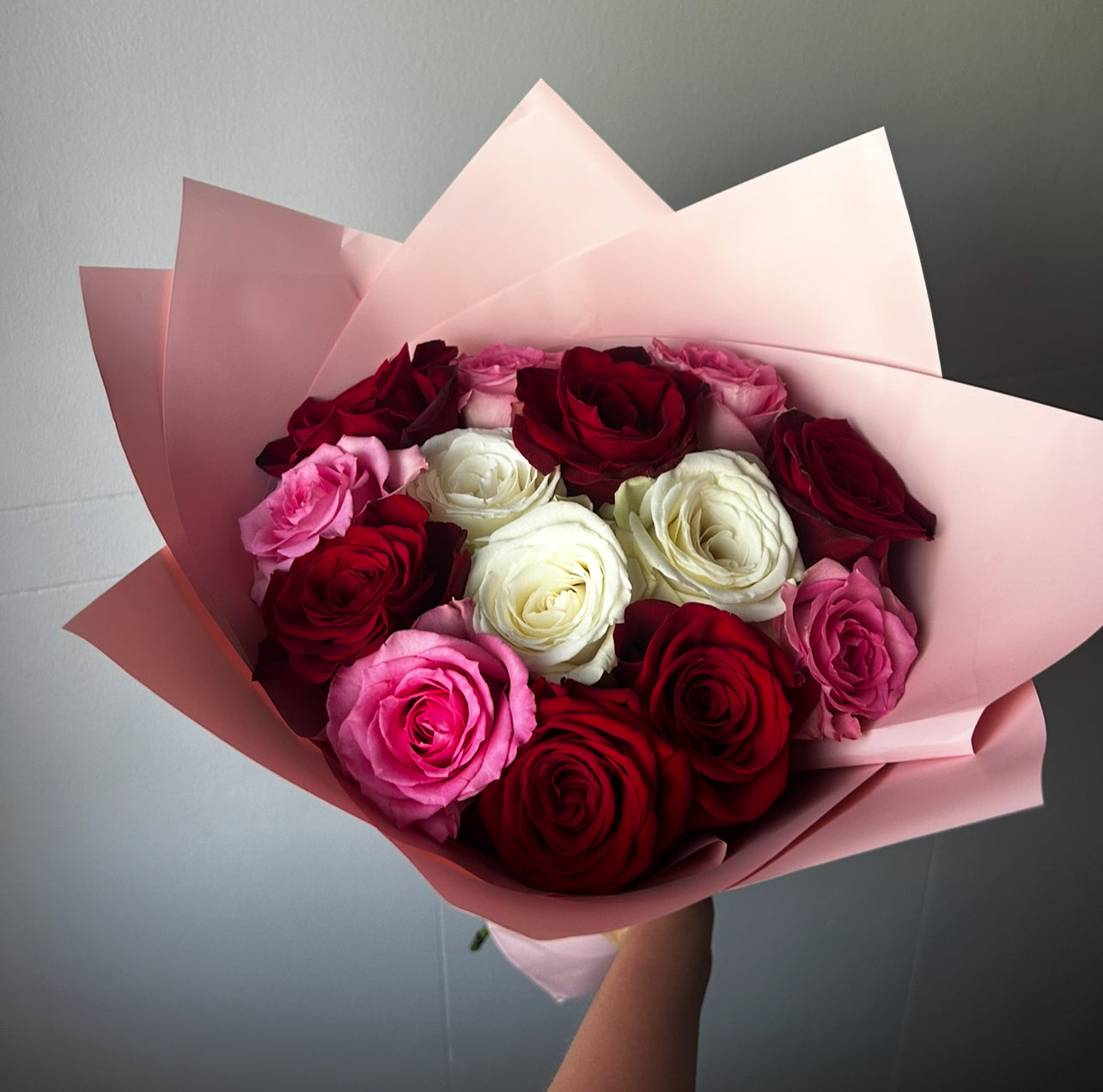 A vibrant bouquet of 15 premium roses in rich red, blush pink, and creamy white hues. Wrapped in soft pink paper for an elegant and romantic look. Flower delivery in Montreal