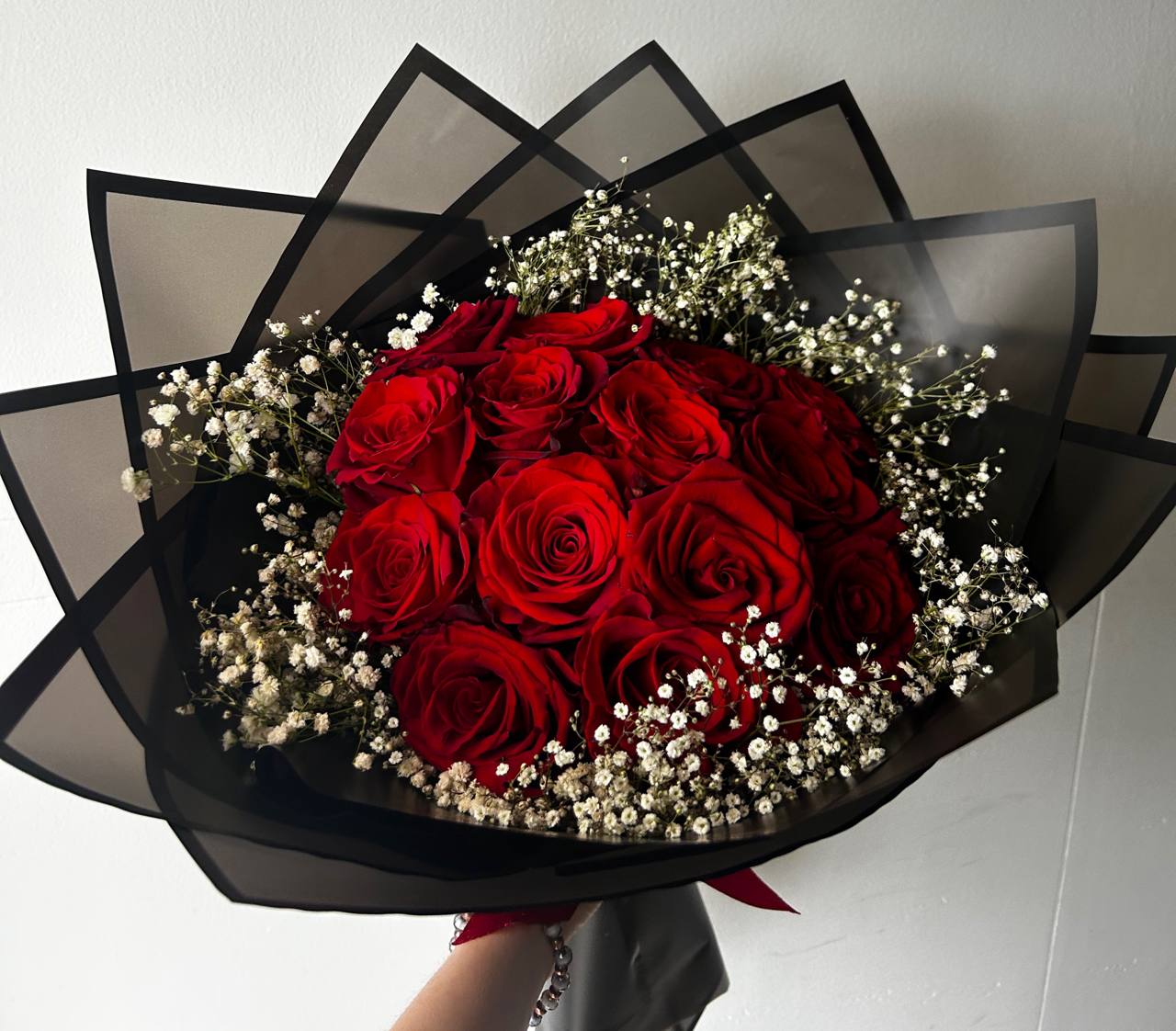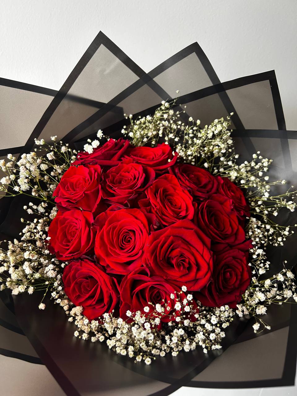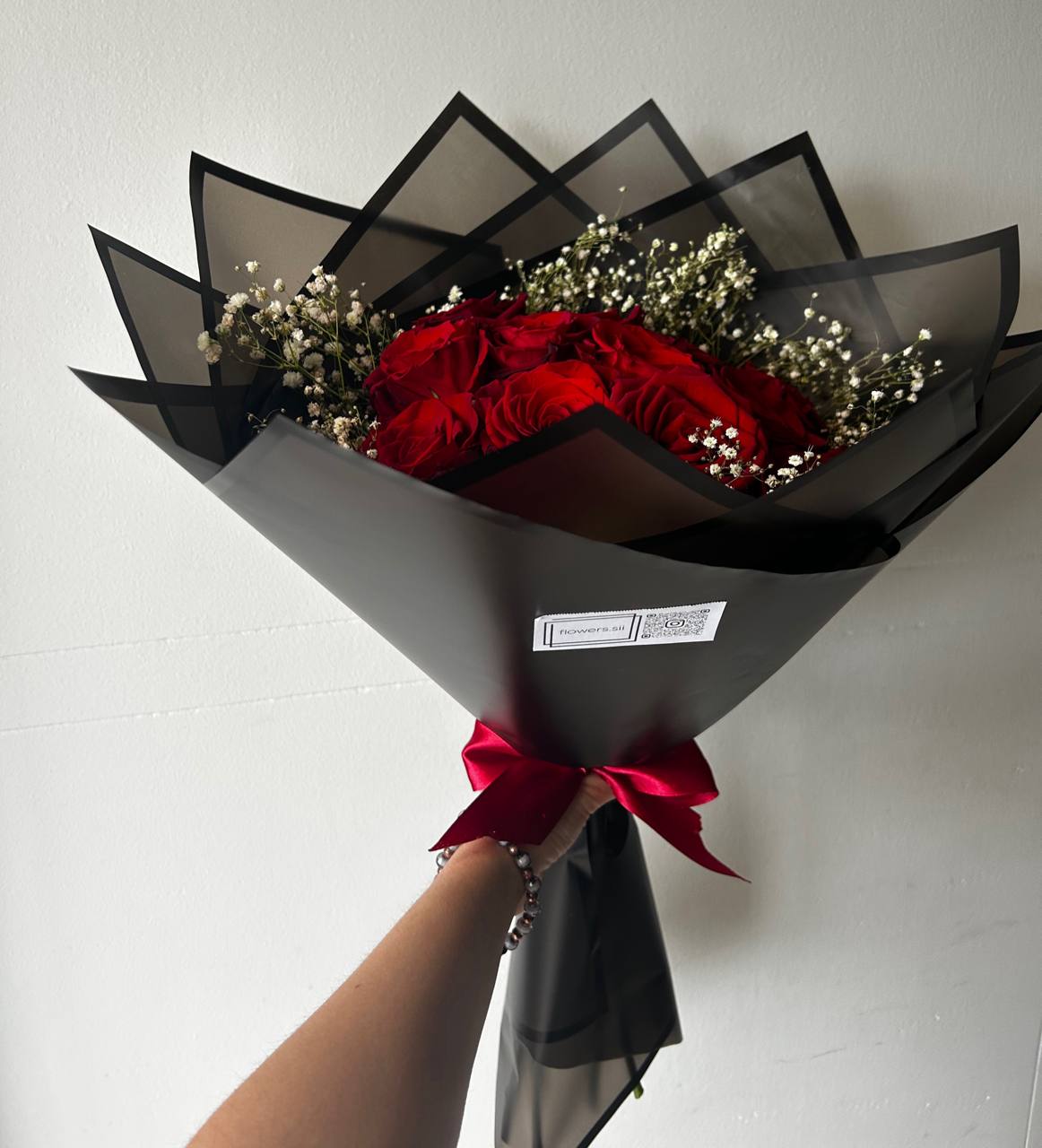 A striking bouquet of 15 deep red roses embraced by delicate baby's breath, wrapped in elegant black mesh. A bold and timeless expression of love and passion. Flower delivery in Montreal