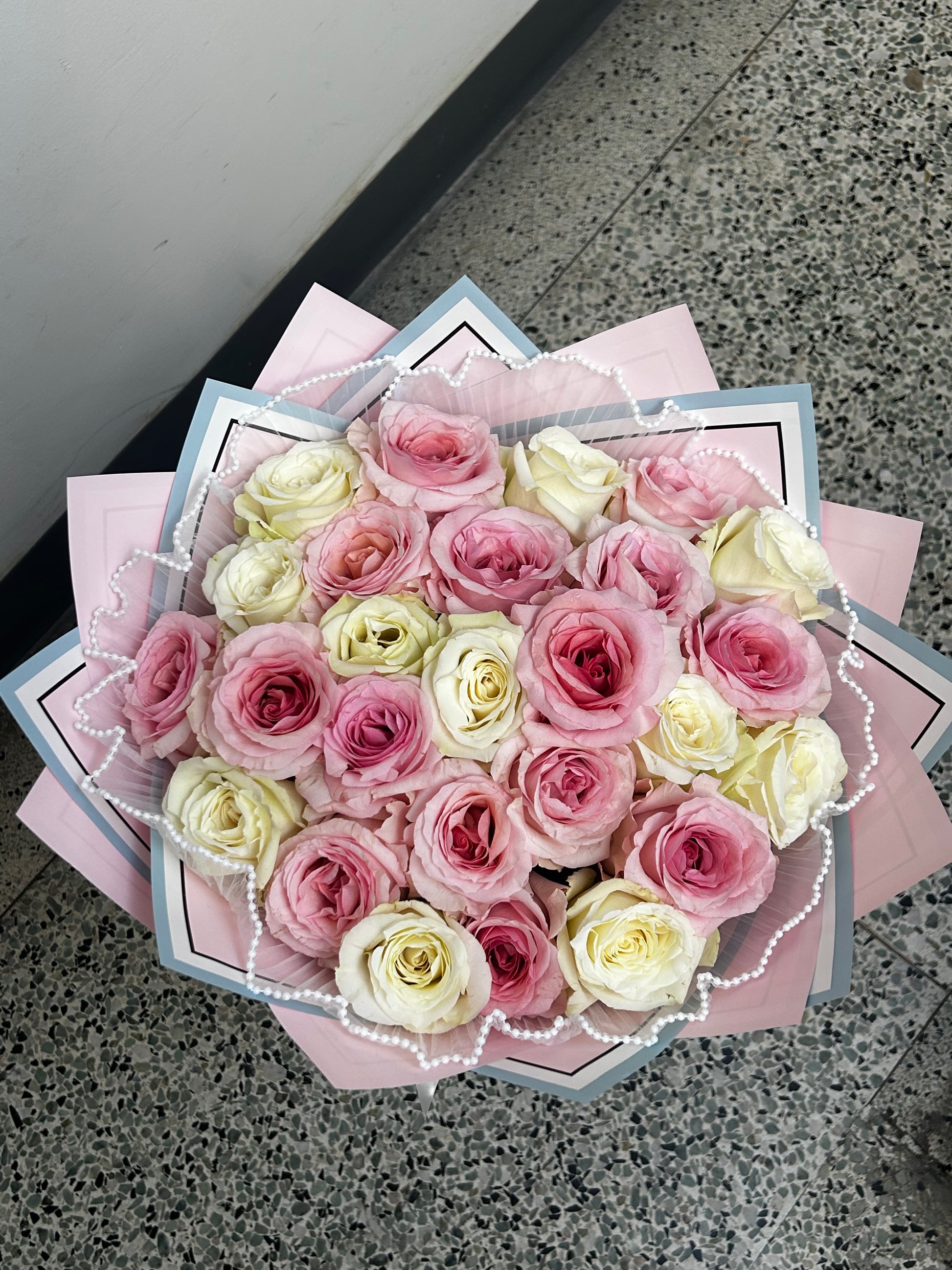 This bouquet features 25 roses in soft pink and creamy white shades, as if crafted from the petals of dawn and gentle light. Wrapped in pastel tones and adorned with pearl details, it radiates elegance, softness, and refined romance.