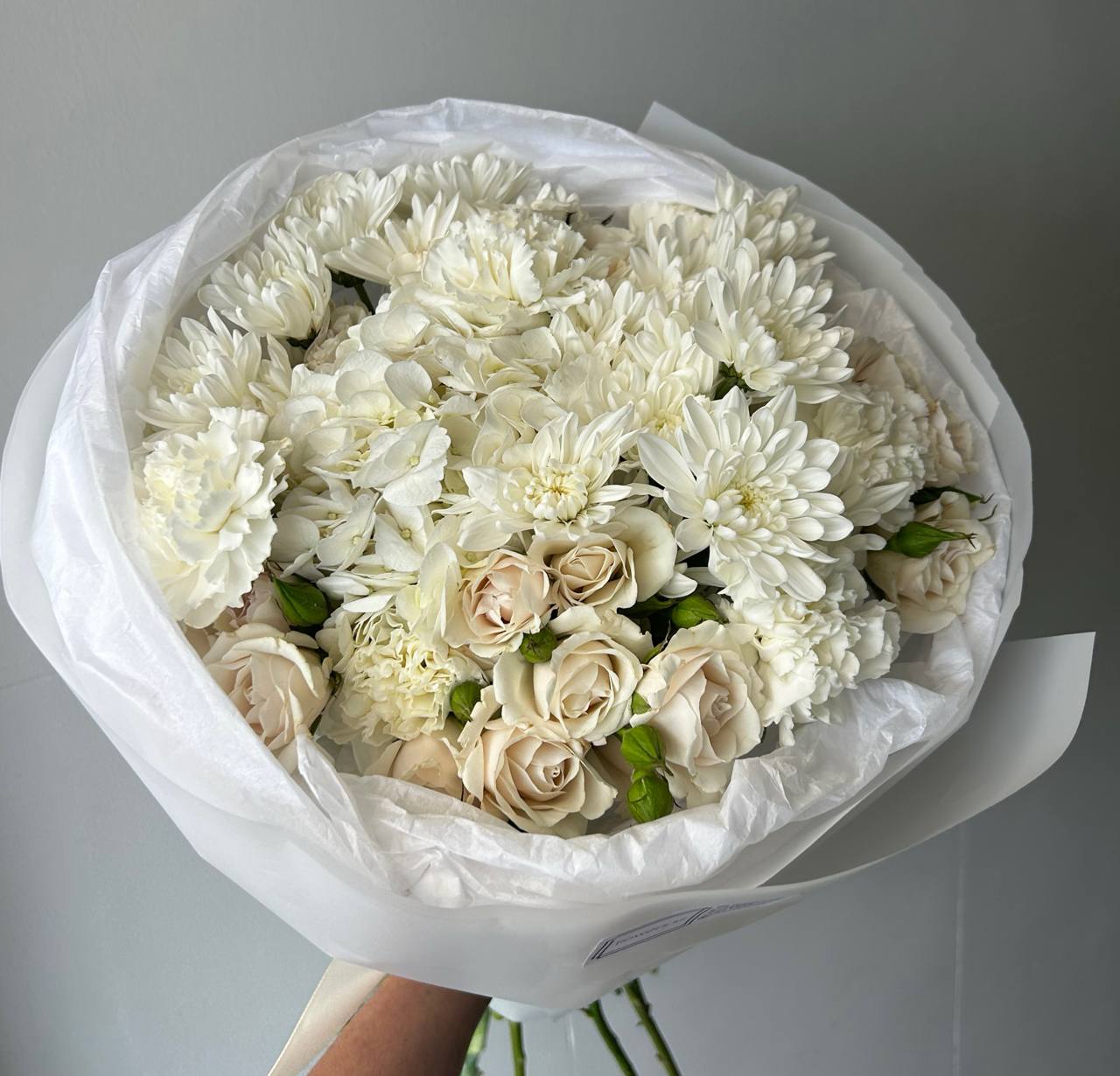A delicate bouquet featuring 3 hydrangeas, 3 chrysanthemums, 5 carnations, and 5 spray roses. Wrapped in elegant white paper. Flower delivery in Montreal